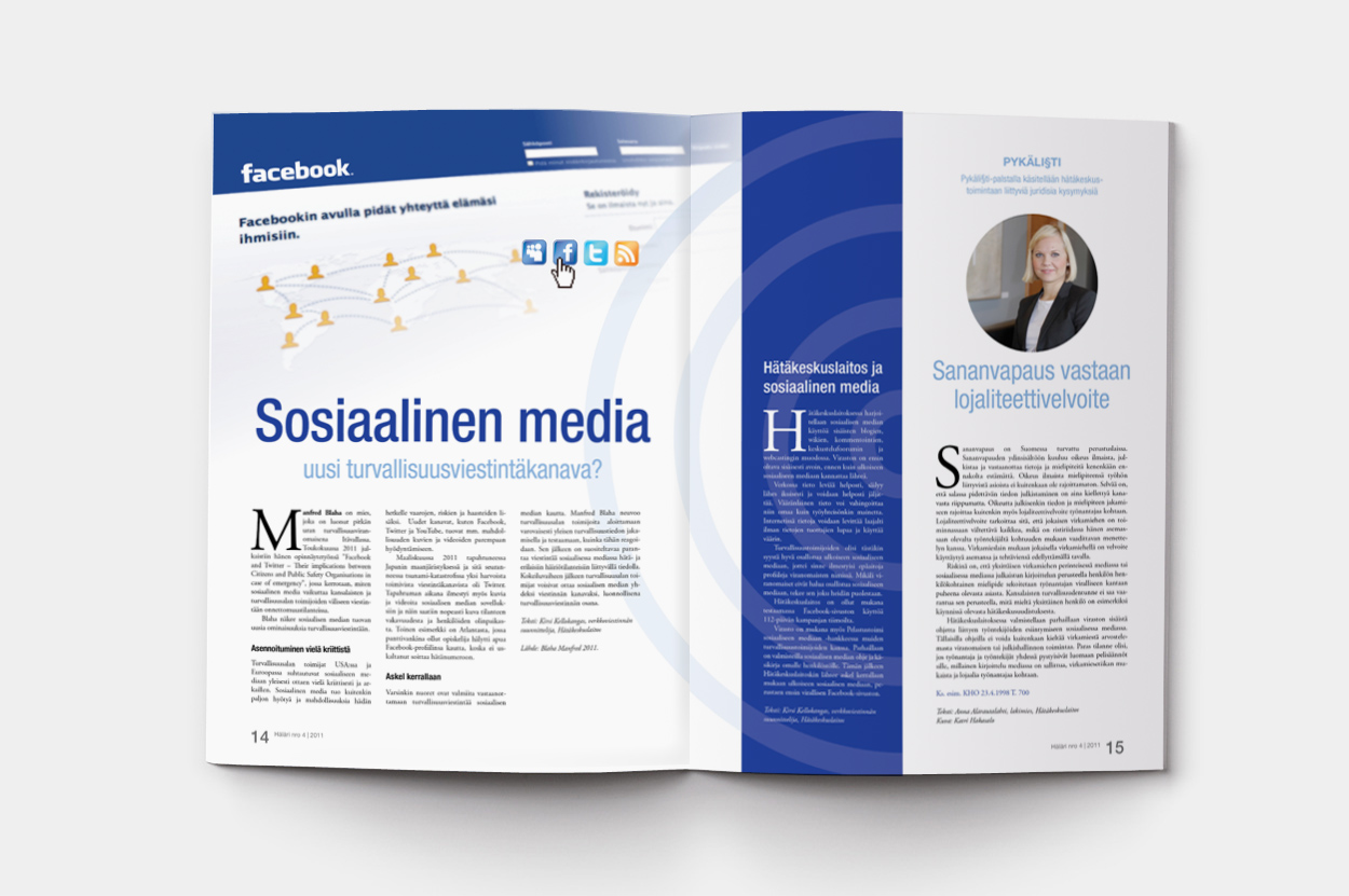 Häläri is Finlands National Emergency Response Centres specialists magazine which is published four times a year. The magazine introduces a wide range of emergency center activities, its experts and a chain of emergency assistance, clarifies the basic operations, raises awareness of the Emergency Response Center and promotes the proper use of the 112 emergency number. Häläris new identity was created to be an interesting, versatile and complete package of information from the professionals of the national Emergency Response Centre.